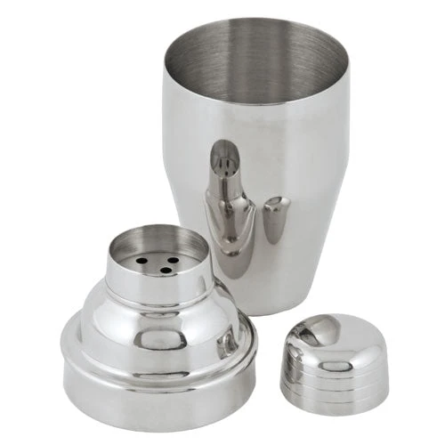 This stainless steel cocktail shaker is perfect for mixing all of your favorite drinks in style! Includes shaker, strainer and cap.