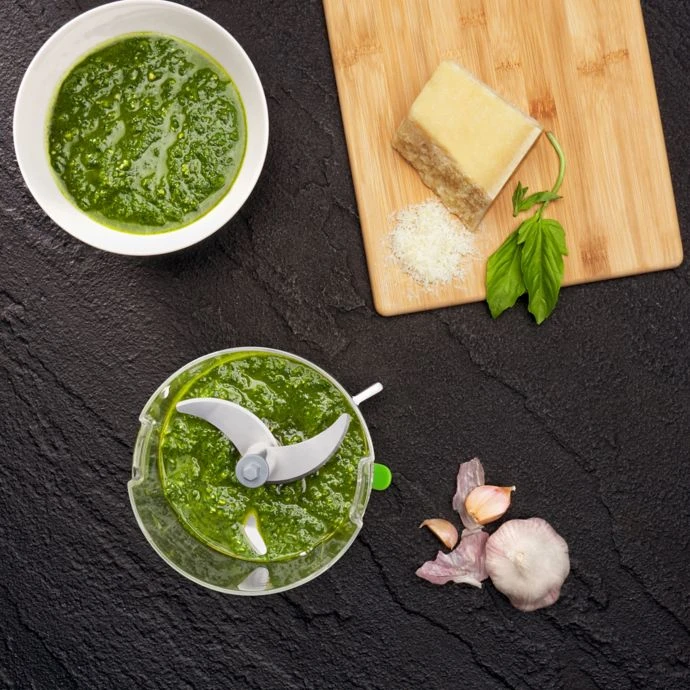 Chop, mince or purée like a professional with the OXO Good Grips One Stop Chop Manual Food Processor. With a simple twist, the power is in your hands to chop fruits, vegetables, nuts and more with 3 sharp, stainless steel blades.