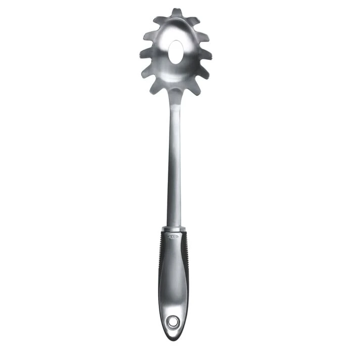 - Sleek, brushed stainless steel handle features flexible non-slip fins for comfort