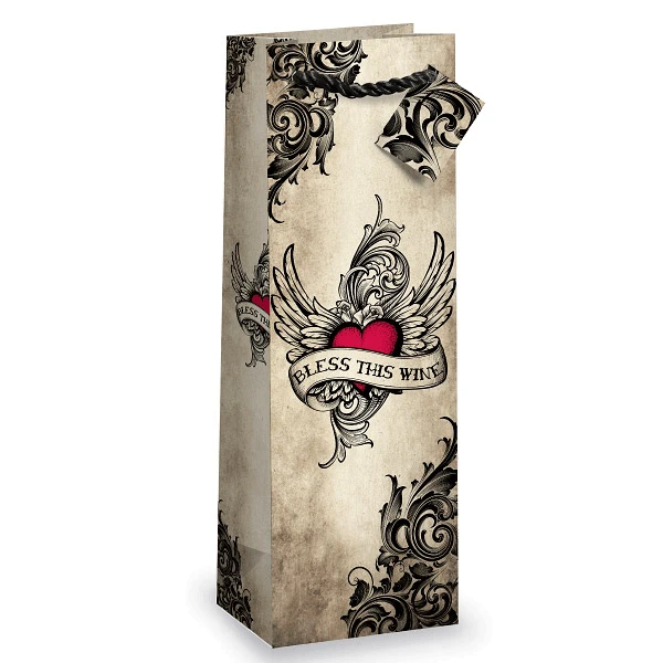 This illustrative bottle gift bag is adorned with winged heart drawings on antiqued backdrop. It includes a gift tag that is threaded onto the soft rope handle. Includes a plastic hanging tab.