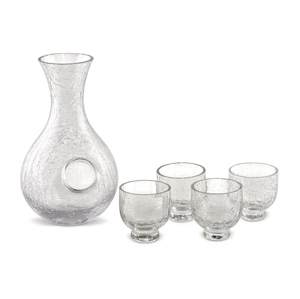 5-piece set. Cracked glass adds a decorative touch and makes a great centerpiece to any Zen happening. Keep your pre-chilled sake cool by dropping some ice into the holder. The coolness of the ice brings out the flavor of the sake. The Epic Sake Set – Clear Crackled Glass is also know as a ice pocket decanter