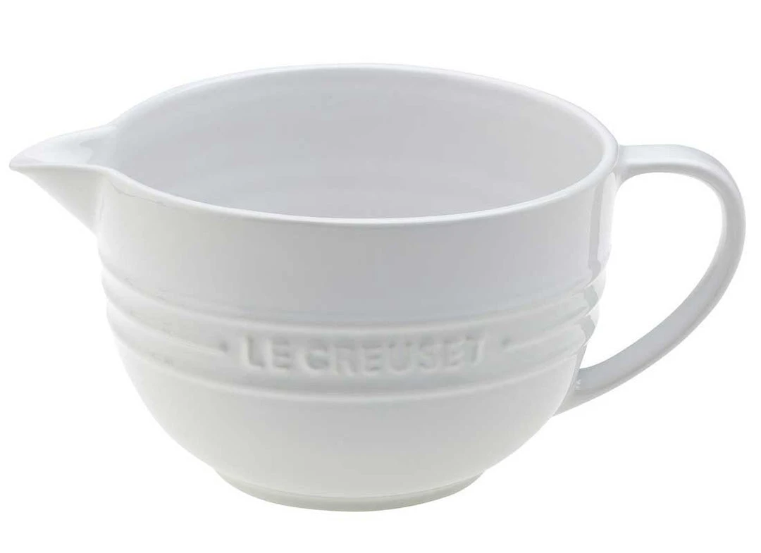 The stoneware batter bowl provides ample room for stirring batter or dough, while its handle and spout provide control when transferring ingredients to a cake pan, baking dish or cookie sheet. Its classic styling includes a full assortment of signature colors as well as raised Le Creuset lettering and rings around the bowl’s midsection.