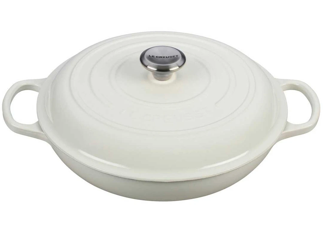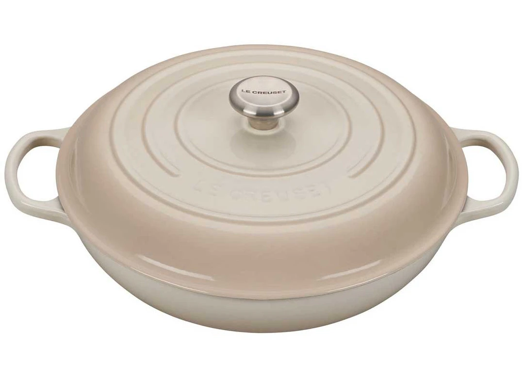 The enameled cast iron braiser is uniquely designed for maximum performance, transforming tough cuts of meat and hearty vegetables into tender, flavorful dishes. Food is first seared over high heat, then finished slowly in a flavorful liquid. The wide base of the braiser allows ingredients to be placed in a single layer for proper searing; once liquid is added, the domed lid continuously circulates steam to lock in moisture and flavor.