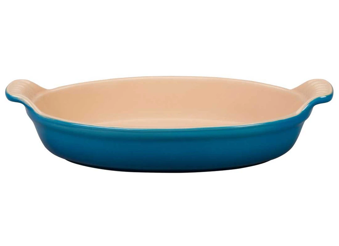 For recipes that call for a crisp topping, the Heritage stoneware oval au gratin dish provides a wide, shallow cooking area in a variety of sizes, exposing ingredients more directly to heat.