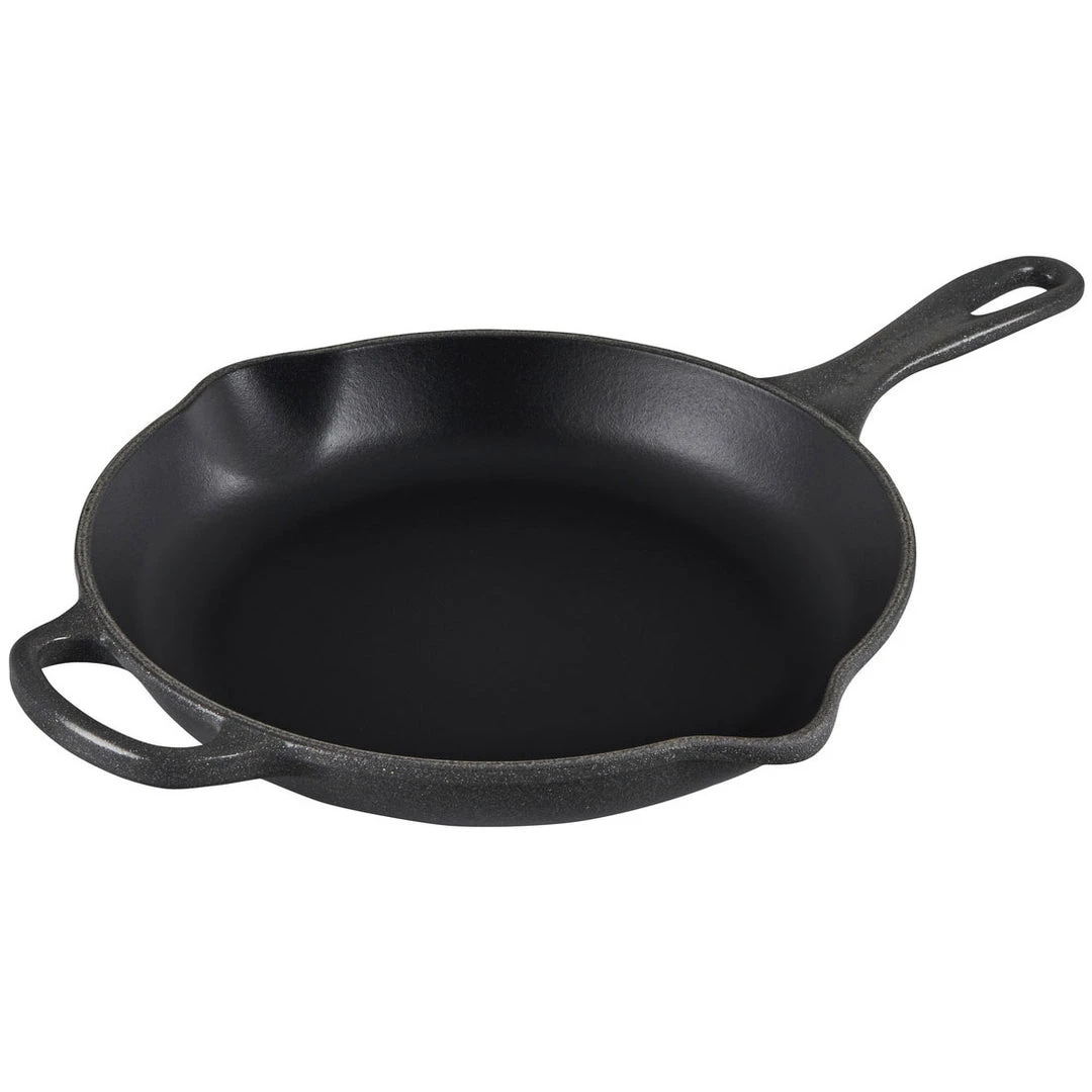 Cast iron skillets are indispensable in the kitchens of home cooks and professional chefs alike. The interior surface of a Le Creuset skillet is finished with a matte black enamel that eliminates the need for the traditional seasoning and maintenance of raw cast iron. Specially formulated for high-surface temperature cooking, the enamel develops a natural patina over time that is ideal for searing, sauteing and frying.