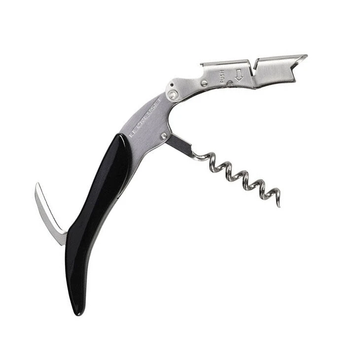 Le Creuset Professional quality Waiter’s Corkscrew – Patented 2-step system improves leverage and makes removal of the cork smoother and easier. The Le Creuset Waiter’s Corkscrew is made of professional quality, stainless steel corkscrew features a non-stick coasted screw, serrated foilcutter and bottle opener. Because the Le Creuset Waiter’s Corkscrew is designed for waiters, it conveniently slips into a pocket, apron or drawer. The Le Creuset Waiter’s Corkscrew evens travel wells too.