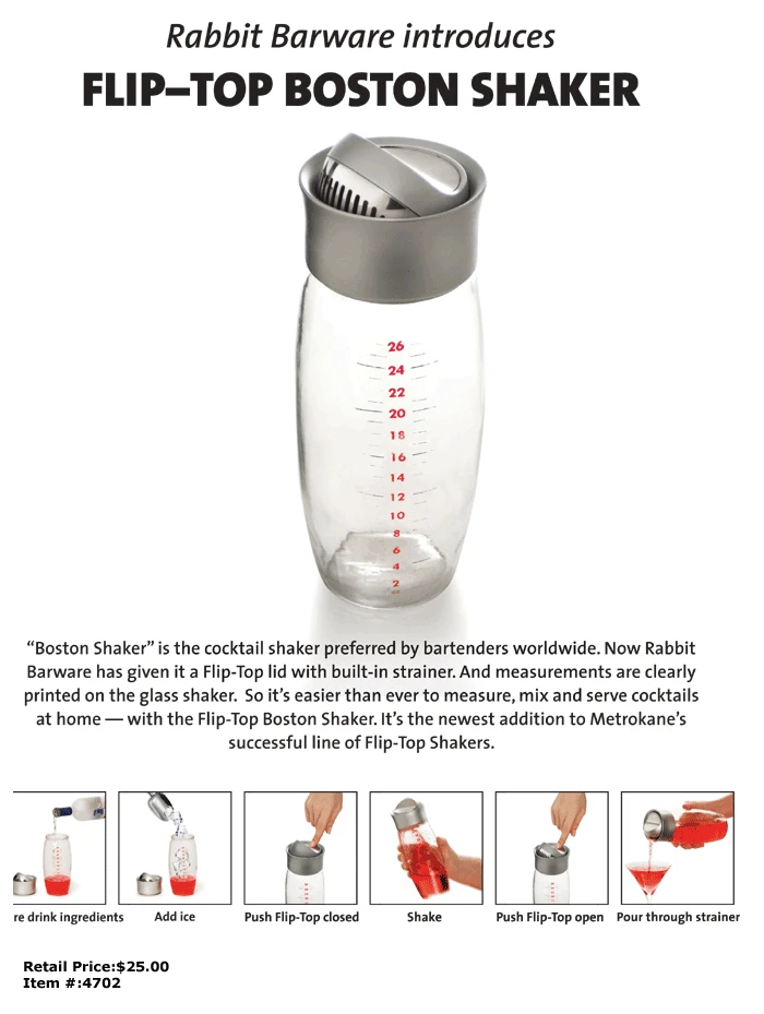 Do away with the usual strainer and lid with the Metrokane Flip Top Boston Cocktail Shaker. With just a touch of a finger, the 26 oz. Metrokane Flip Top Boston Cocktail Shaker opens and closes, supplying ease of use in a beautiful package. The Metrokane Flip Top Boston Cocktail Shaker was developed over the course of two years and employs hydraulic engineering applied to hi-tech sealing materials. The Metrokane Flip Top Boston Cocktail Shaker is the first real innovation in cocktail shakers since prohibition. Measurements are clearly printed on the glass of the Metrokane Flip Top Boston Cocktail Shaker so it is easier that ever to measure, mix and serve cocktails at home