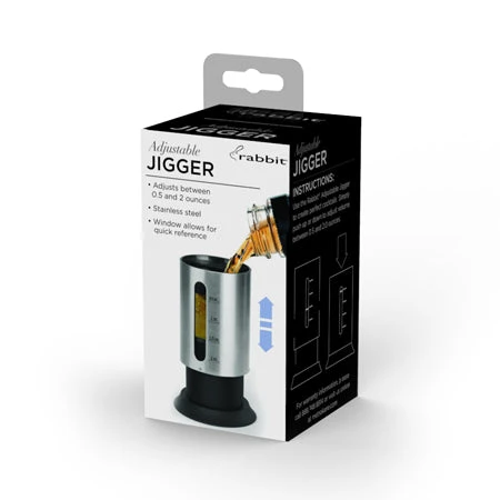 The Rabbit Adjustable Jigger is constructed of durable stainless steel. The jigger adjusts between 0.5 and 2.0 ounces for a wide range of measurements. The clear window allows for a quick reference to ensure accuracy.