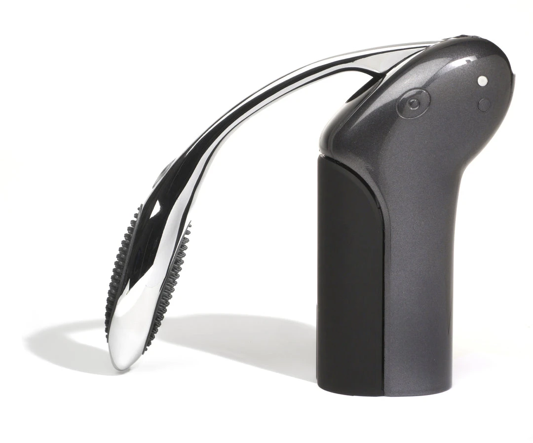 Metrokane couldn’t design a better corkscrew than the original Metrokane Rabbit Corkscre, so they designed a totally different one. They call is Metrokane Vertical Rabbir Corkscrew, because it stands up on the wine bottle and operates vertically. Like the original Metrokane Rabbit, it pulls a cork in three seconds, ejects the cork automatically and carries a 10 year warranty. The Metrokane Vertical Rabbit has a die-cast metal lever handle and comes in your choice of hi-sheen racing-car finishes: Gun-Metal, Candy-Apple Red and Velvet-Black. The Metrokane Vertical Rabbit parks in a hinged lucite presentation case.