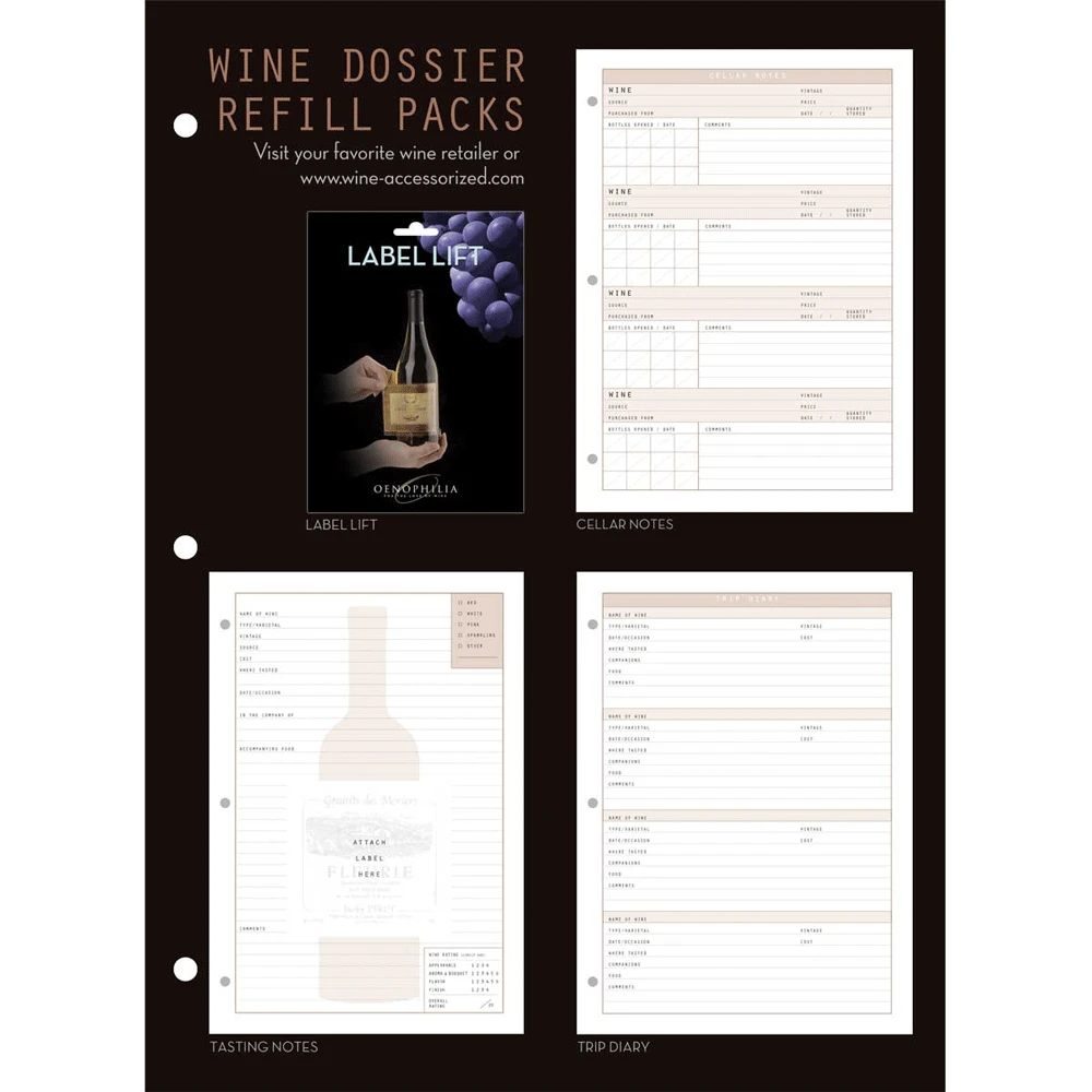 Wine appreciation occurs on so many levels, and our beautiful, exclusive Wine Dossier affords the opportunity to keep a thorough catalog of cellar and tasting notes, with a special “trip diary’ section for briefer jottings on the fly. The Wine Dossier is a refillable 3-ring binder and has a zippered, embossed, cordovan cover. The Wine Dossier comes with 10 Label Lift label removers in a reclosable, multipurpose pouch. 160 pages. Double-sided refill pages for the Wine Dossier are sold as separate.