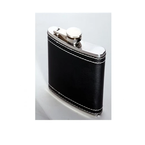 The Oenophilia Wine Leather Flask w/ Stitching is a stainless steel flask wrapped in black leather with contrasting white stitching. The Oenophilia Wine Leather Flask w/ Stitching includes captive top and come ins a great gift box.