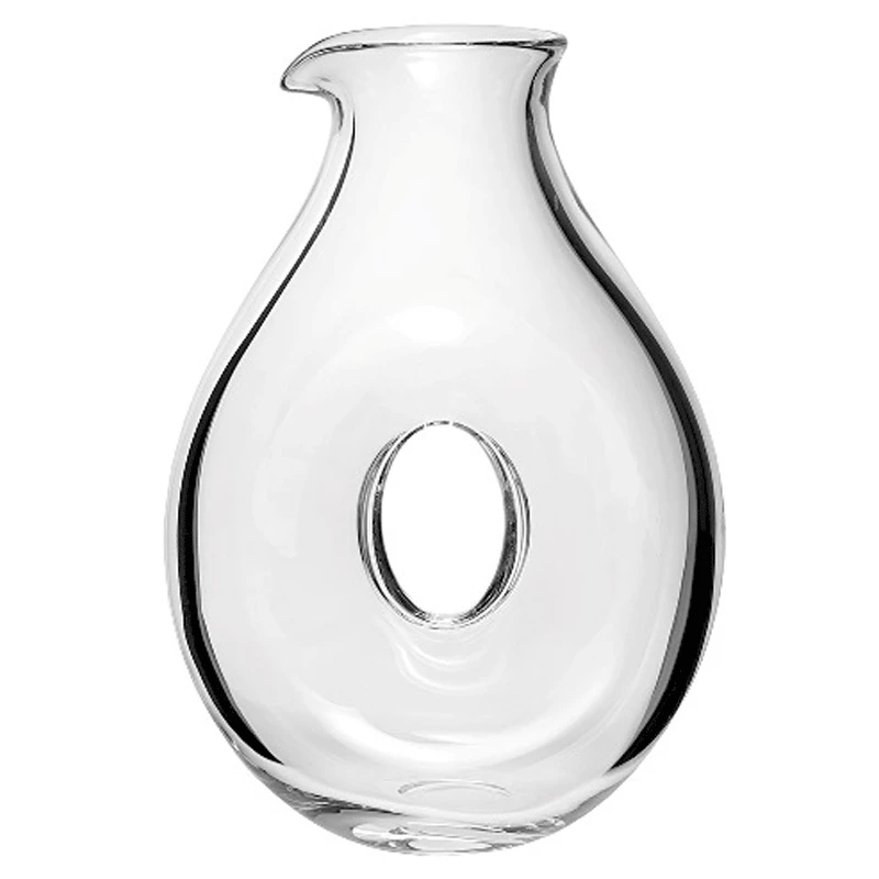 Oval Decanter – 1 qt. 2 oz. capacity. Reminiscent of wine bottles you see in parts of Europe, the unique “doughnut” design of this oval decanter isn’t only to make your guests sit up and take notice (although they will). The circular design of the Oval Decanter aerates the wine more efficiently, as it pours through both sides of the “doughnut,” allowing the flavors to develop more fully. The Oval Decanter helps keep sediment in the bottom of the bottle, too. Let the Oval Decanter inspire conversation as well as your wine! 6-3/4″ wide, 9-1/2″ tall.