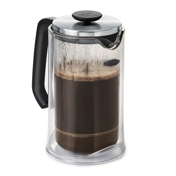 Enjoy delicious French press style brewed coffee with the 8-Cup French Press Coffee Maker from OXO Good Grips. An inner thermal-shock-resistant glass carafe is protected and insulated by a clear Tritan shell and a comfortable grip make pouring a pleasure.