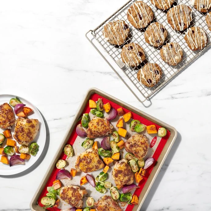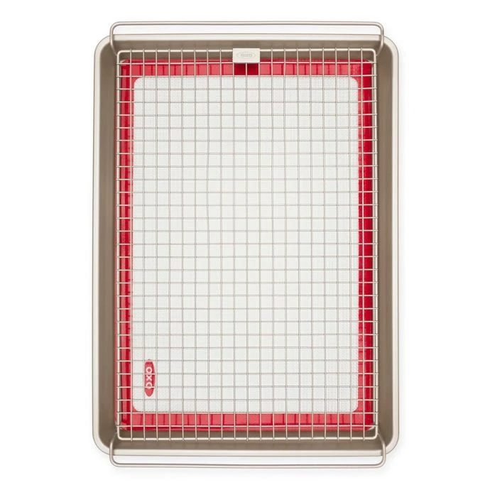 Easily bake cookies, croiossants, and more with this OXO Good Grips 3-Piece Nonstick Bakeware Set that includes a pan, rack, and mat. Square rolled edges let you get a firm grasp when inserting and removing pan from the oven to avoid spills.