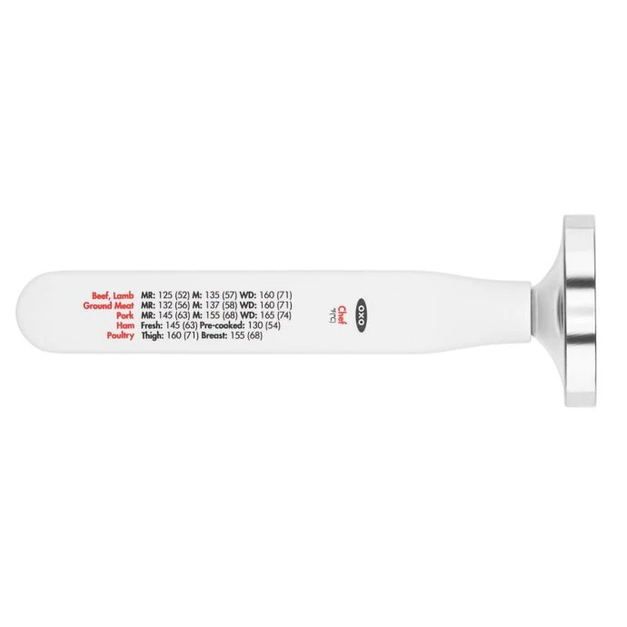 - Convenient storage sleeve has the recommended cooking temperatures and Celsius conversions