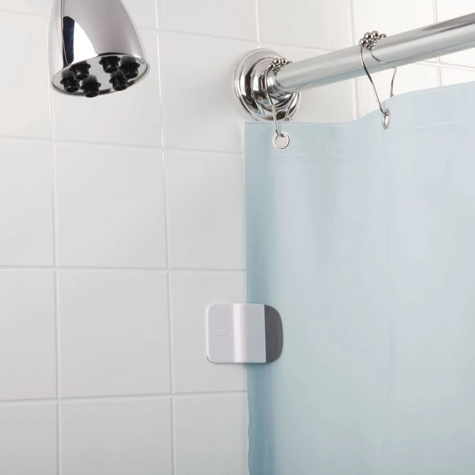These clever non-slip clips hold your shower curtain to the wall, to keep water in the shower where it belongs. Adhesive tape keeps the clips in place on the wall.