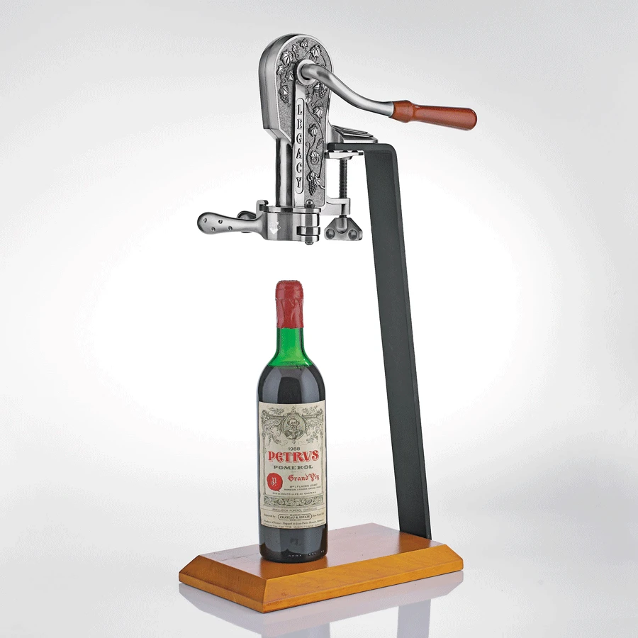 Enhancements to our best-selling, Legacy Stationary Corkscrew with Birch Stand, a regal replica of an antique corkscrew, promise years of effort-free openings. A smooth-gliding, Teflon-coated worm removes corks (natural and synthetic) with a simple pull of the handle. Inner workings and grapevine-relief casing made of lasting zinc alloy. Can also mount to your bar. The corkscrew is synthetic cork friendly.