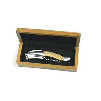 This precision-made corkscrew requires 160 hand detailing steps to complete. Double curved design. Hefty, but balanced, weight makes extraction both smooth and easy. Satin finish stainless steel parts include heavy bolster on both sides of the center wood inset, 2 inch serrated blade, wide boot lever and 5-turn spiral.