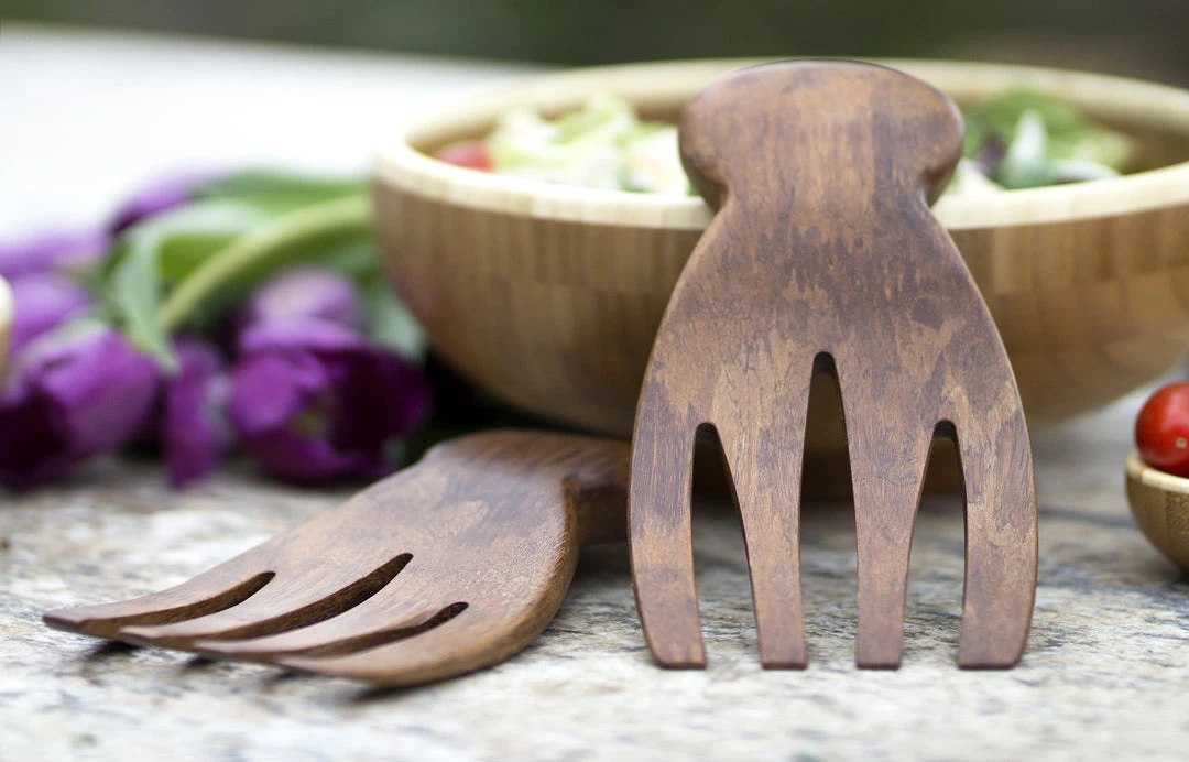 Let’s face it, the easiest tools for tossing and serving salad are your own two hands. But the next best and much less messy alternative is a pair of our natural bamboo salad hands. Toss, mix and serve with ease, while the little button on the back of each ‘wrist’ keeps the hands from sliding into your bowl. Oh, and did we mention pasta? From angel hair to ziti, these hands serve it up with ease.Â