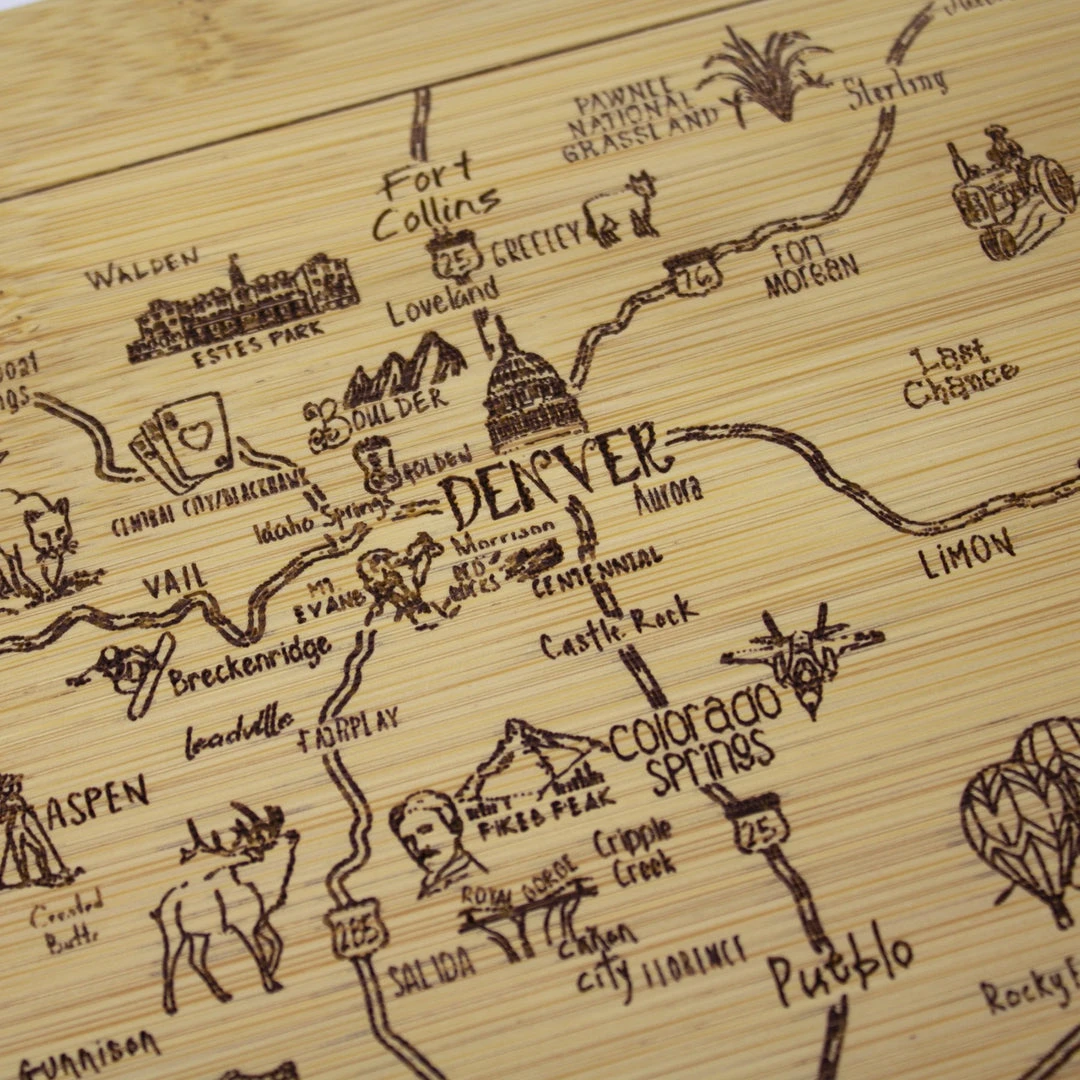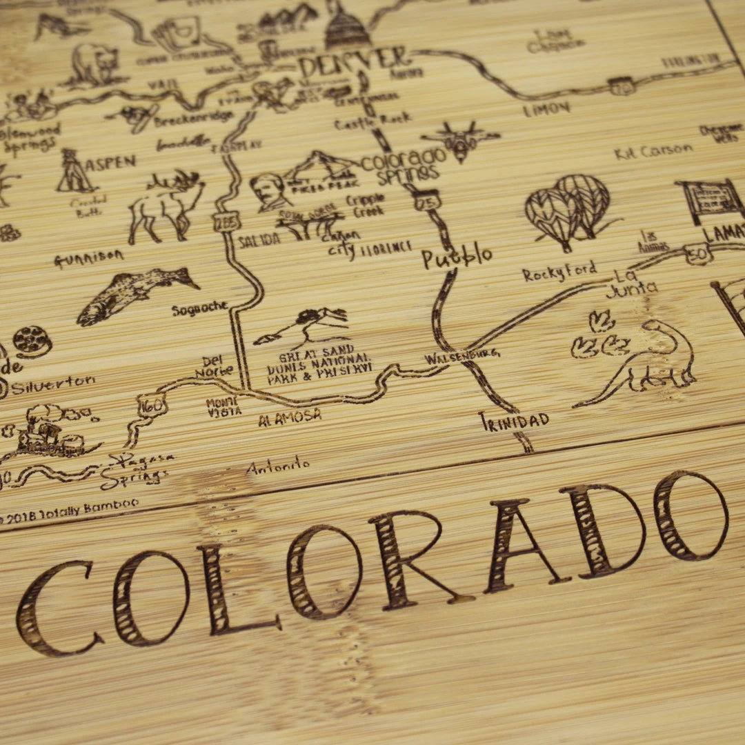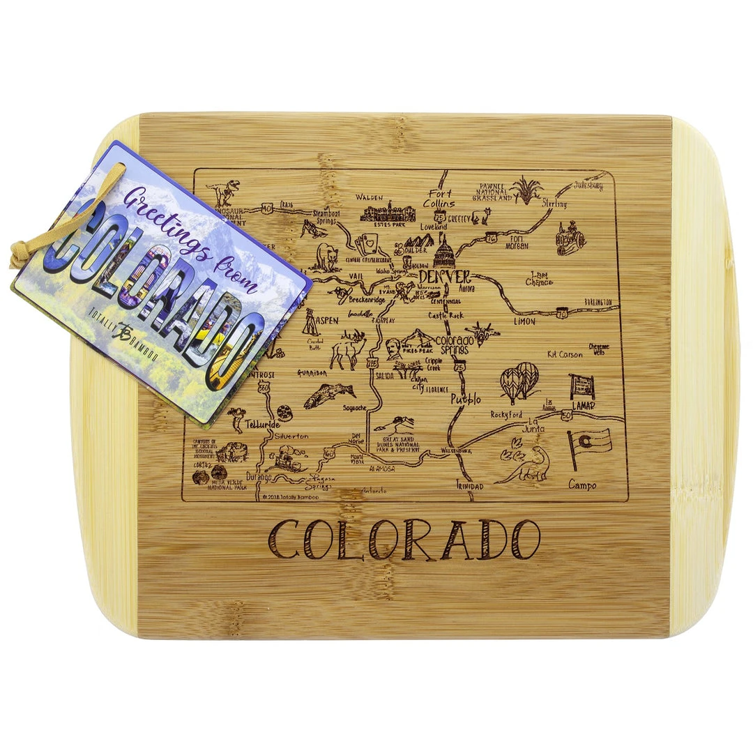 Savor a slice of The Centennial State with the Totally Bamboo A Slice of Life Colorado Bamboo Serving and Cutting Board! This eye-catching serving board is a wonderful way to celebrate the state of Colorado. It’s a perfect choice to serve a selection of delicious cheeses, crackers and finger foods with friends and family. One side of the board features laser-etched artwork of the outline of the state and fun call outs of the top cities, sights and attractions. From Denver to Aspen, Fort Collins to Colorado Springs, Pikes Peak to The Great Sand Dunes and everywhere in between, this board features everything that makes Colorado great. When not being used for serving, the board can be flipped over to provide an ideal large cutting board surface. The board is constructed of organically-grown Moso bamboo, which is gentler on knives than plastic and easier to care for than hardwood. The two-tone design clearly highlights the natural beauty of bamboo. The board measures 11″ x 8-3/4″ x 1/2″. Whether as a gift for the Coloradoan in your life (or for yourself), this Slice of Life board is sure to be a hit!