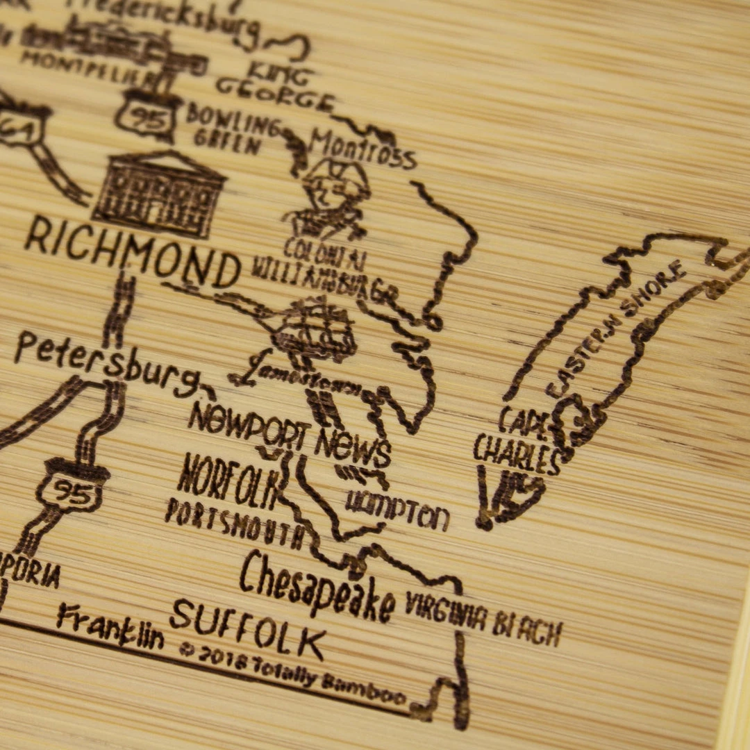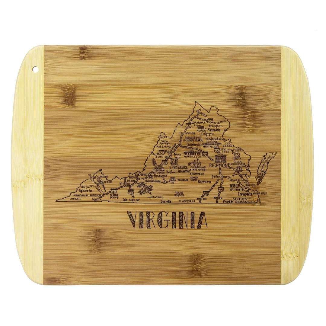 Savor a slice of The Old Dominion with the Totally Bamboo A Slice of Life Virginia Bamboo Serving and Cutting Board! This eye-catching serving board is a wonderful way to celebrate the state of Virginia. It’s a perfect choice to serve a selection of delicious cheeses, crackers and finger foods with friends and family. One side of the board features laser-etched artwork of the outline of the state and fun call outs of the top cities, sights and attractions. From Virginia Beach to Alexandria, Roanoke to Fredericksburg, Monticello to Jamestown and everywhere in between, this board features everything that makes Virginia great. When not being used for serving, the board can be flipped over to provide an ideal large cutting board surface. The board is constructed of organically-grown Moso bamboo, which is gentler on knives than plastic and easier to care for than hardwood. The two-tone design clearly highlights the natural beauty of bamboo. The board measures 11″ x 8-3/4″ x 1/2″. Whether as a gift for the Virginian in your life (or for yourself), this Slice of Life board is sure to be a hit!