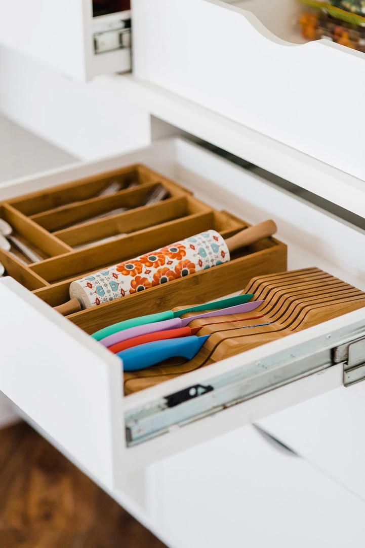 What’s in your drawers? If you answered, “a mess!”, then we have the solution! Our Expandable Utensil Drawer Organizer has 6 fixed and 2 adjustable-width compartments for organizing and storing all your flatware and utensils.Â