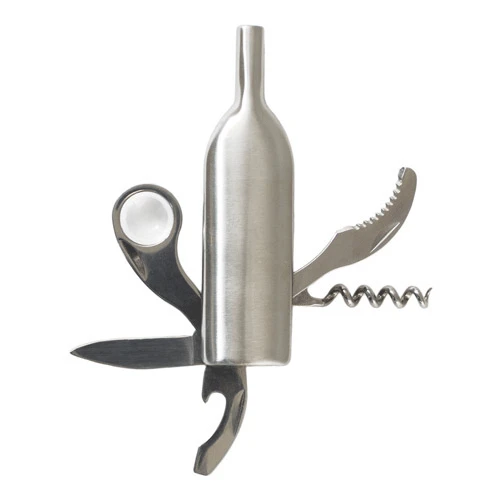 - Serrated foil cutter, magnifying glass, cutting blade, bottle opener and corkscrew.