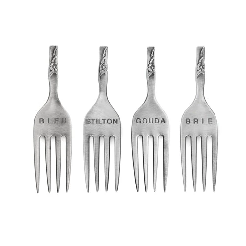 Add some class to your table with these delicately refined cheese accessories. This set features four cheese markers, each with a cheese varietal: Bleu, Brie, Gouda, Stilton.