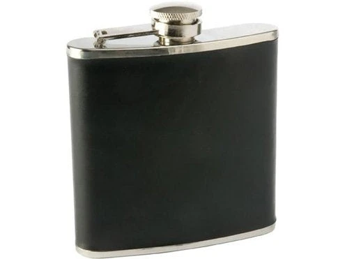 Our handsome Monte Carlo flask is made from black faux leather and stainless steel. It can also be customized with your own logo. Holds 6 oz.