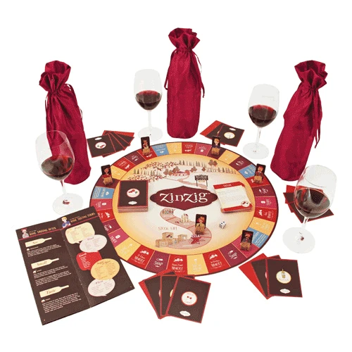 ZinZig is the Wine Tasting and Trivia Game that will challenge your mind and palate. Plan carefully, and plot strategically as the first player to taste their way to the winery wins! It doesn’t matter your level of wine tasting experience, you will have fun, and learn a little about wine tasting along the way. This game includes: 6 winemaker pieces, 3 bottle covers for the blind wine tasting, a wine tasting guide, 9 winery deeds, 250 trivia cards, 50 blind wine tasting cards, and one die. For 2-6 players or teams. Wine not included.