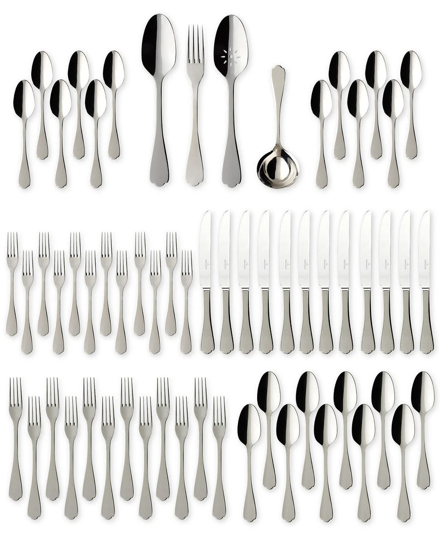 The 64-Piece Set includes (12): dinner forks, salad forks, dinner knives, dinner spoons and teaspoons. Plus (1): meat fork, pierced serving spoon, vegetable spoon, gravy ladle. 18/10 stainless steel. Dishwasher safe. The set consists of: