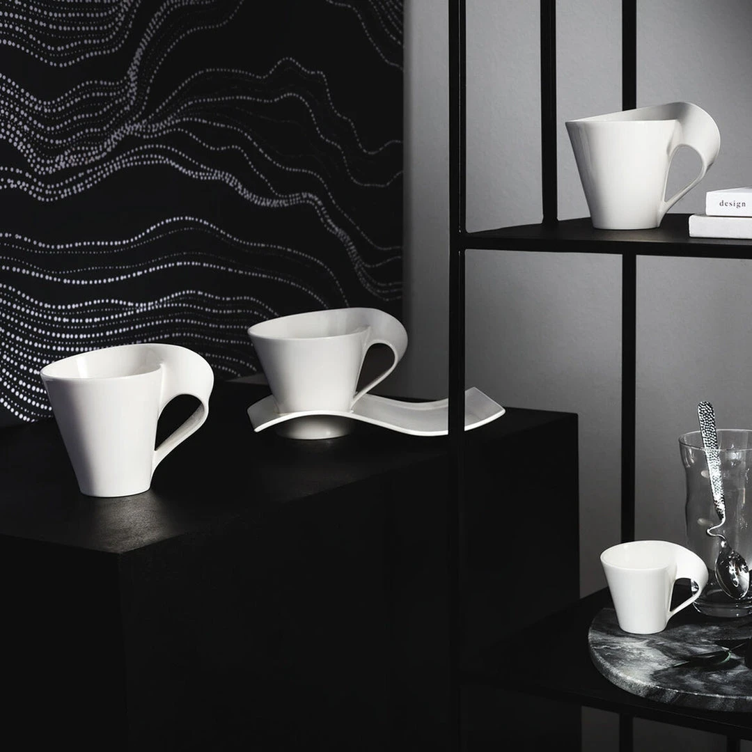The NewWave Caffè décor is eye-catching on any coffee table! Tasty treats look twice as appetizing, and the elegant wave design looks especially snazzy. Add a striking touch to your coffee break and enjoy the moment with the large NewWave Caffè cup with a curved handle. Add an extravagant touch to your coffee.